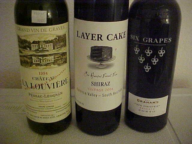 There will be only four of us tonight, and only three of us will be drinking. We have one none drinker! I plan to start out, pre-meal, with a bottle of Grand Vin De Graves "Pessac-Leognan" 1994 Chateau La Louviere that I purchased in 1998 while still living in Illinois, at $20 a bottle back then. After this bottle, I'll still have three left. During the meal, we'll enjoy a bottle or two, if needed (I have six), of Barossa Valley- South Australia 2006 Layer Cake Shiraz (about $15). Later, with dessert, we'll open a bottle of Graham's "Six Grapes" Reserve Porto (About $24).