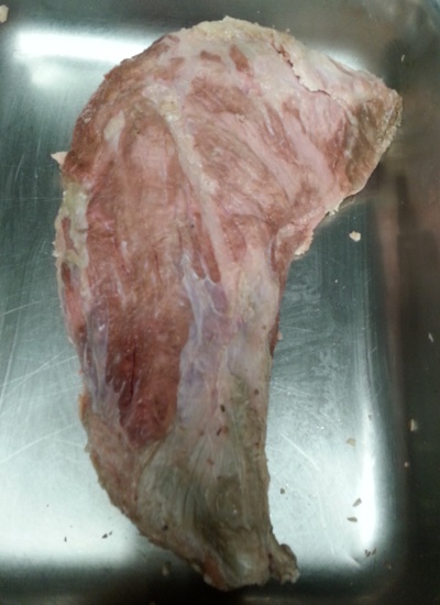 The other thing that surprised is the amount of fat left in the meat. My research led me to believe that 60 hours - even at 136* - was ample time to really render the fat sufficiently. This photo, I think, says otherwise.