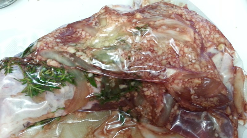 After 50+ hours in the water bath, you can see a boat load of juices in the sealed pouch