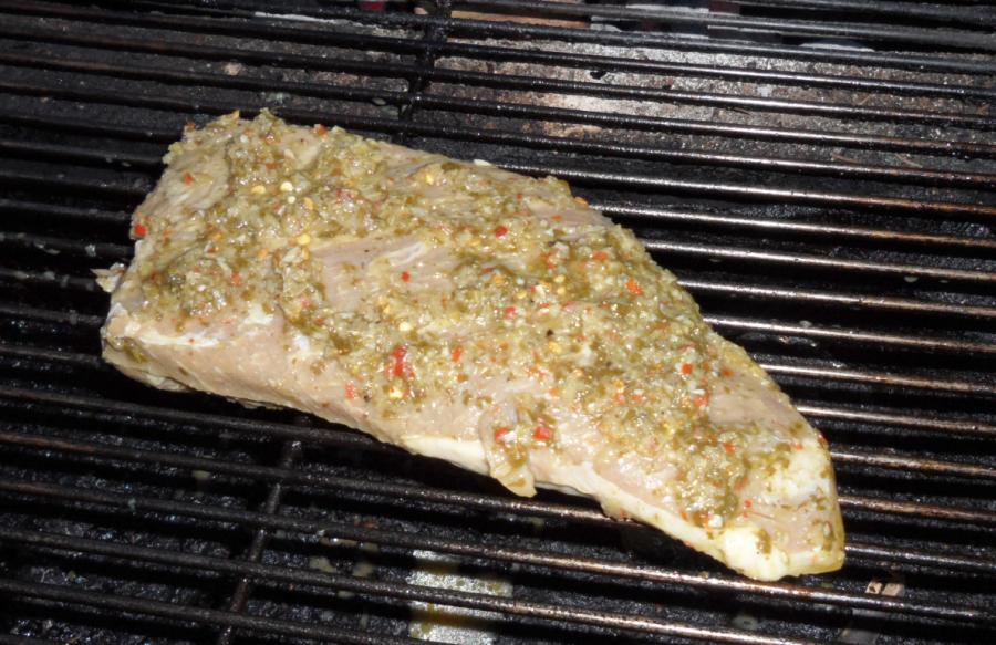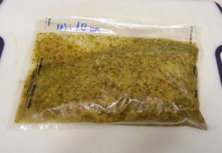 6 hours in the marinade and going on the smoker w/ mesquite - I meant to marinade for only 4 hours, but things got in the way and I was delayed. In retrospect, for this smaller cut, my initial thoughts were probably right, 4 hours would have been plenty, or maybe I only needed 3 hours, but 6 was too much - it was too bitey from the extra time in the lime and vinegar: