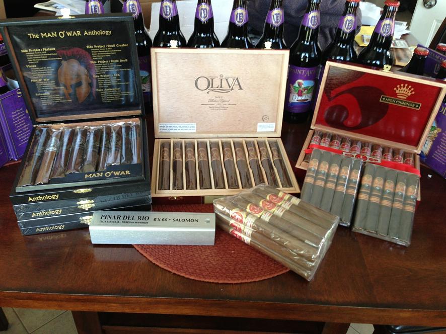 box of Cain Habanos Double Toros, 20 Oliva Serie O maduro robustos, 2 x 10 My Uzi Weighs a Ton 5 x 60, and a fiver of JdN Antano 1970 consuls