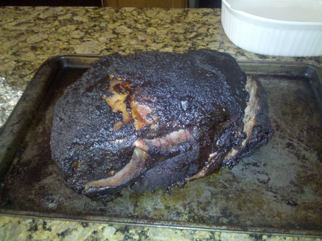 Here is my sad pork butt, it was pretty easy to scrape off the stuff on the outside...the meat is awesome! Super moist and tastes great!