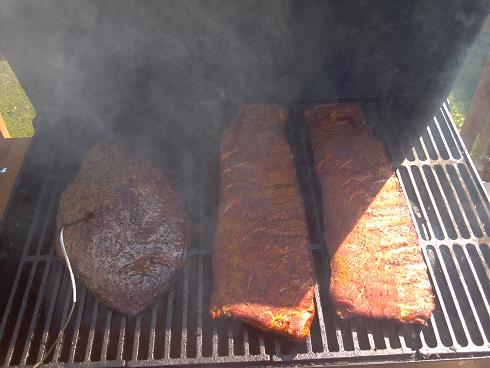 Two big St. Louis slabs and a flat cut brisket. Ribs are almost done, the striated cracks in the crust tell all. They were delicious.