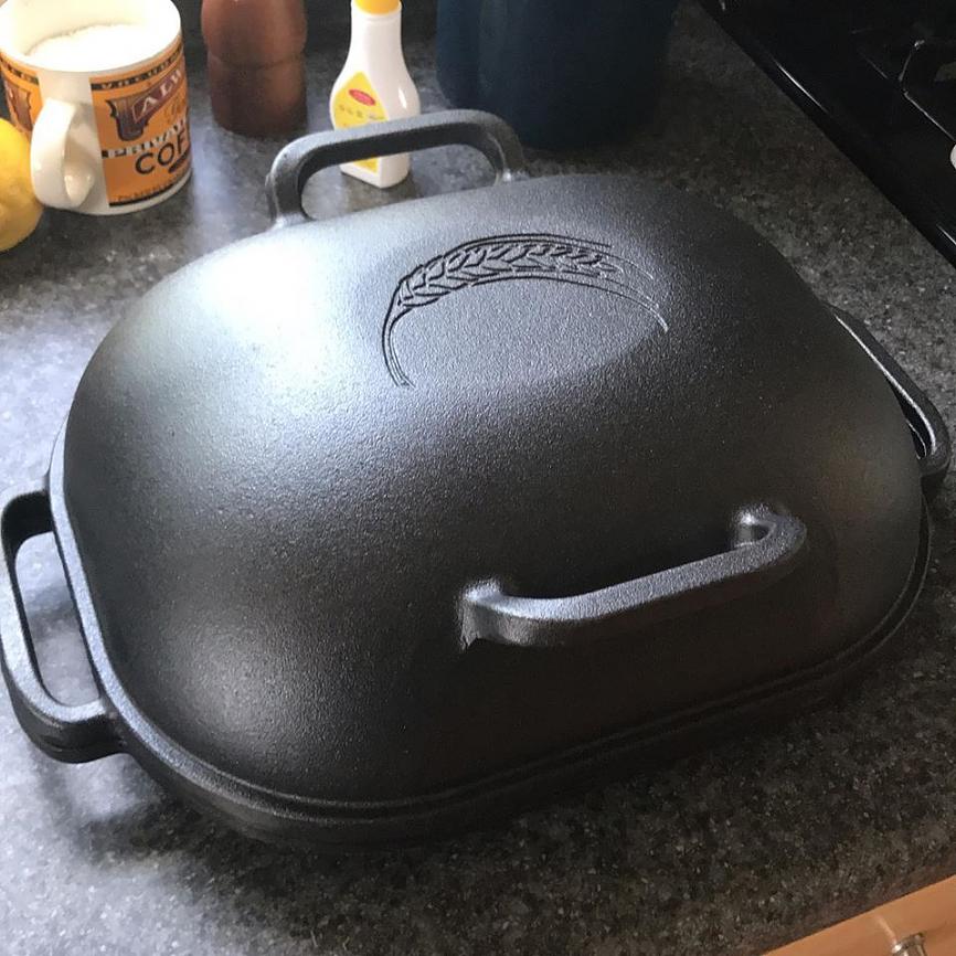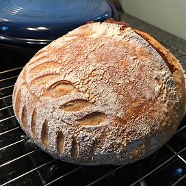 Bought a new cast iron bread pan last week, from Challenger Breadware. Got to put it to use with another sourdough loaf. Big improvement over the previous loaf. Partly due to a longer proofing, but also from the pan. Allows me to crank the over to 500F, without fear of cracking the pan. With the dutch oven, I'd only go to 475F. And the pan holds the heat a lot better.