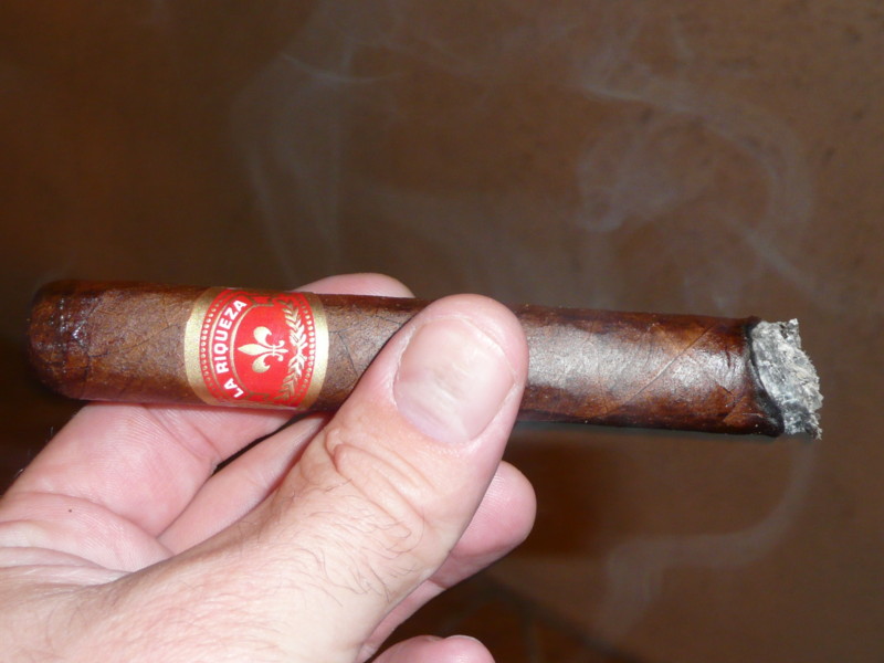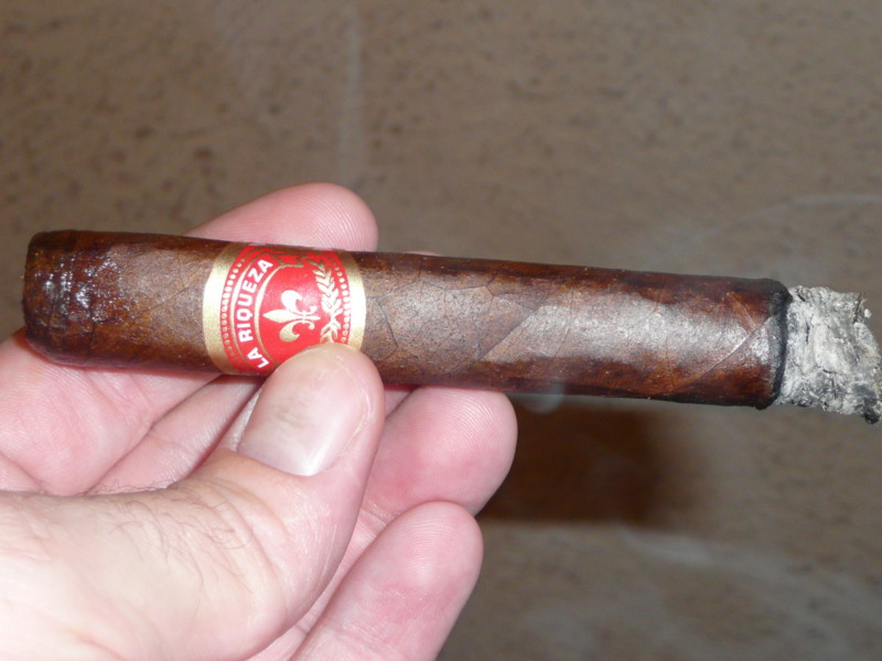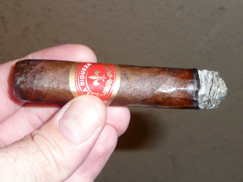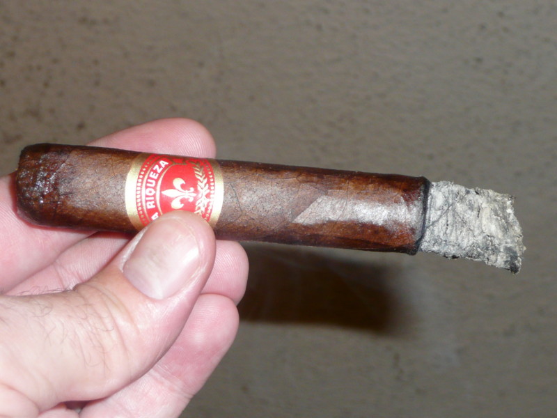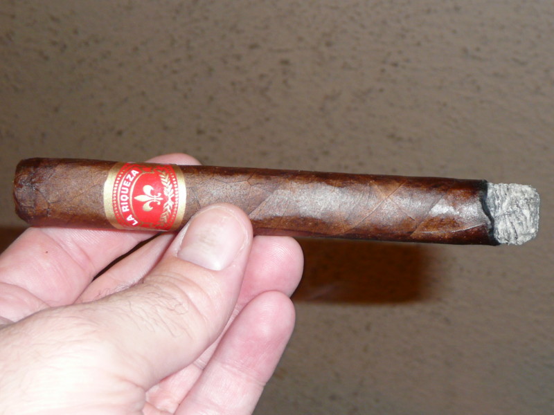 The draw was tight (as on many La Riqueza) on this "slight" stick, yet it burned very evenly throughout, imparting a good amount of smoke, yet due to it's seemingly light girth was not a comfortable "feel" in the hand (almost cigarette-like).