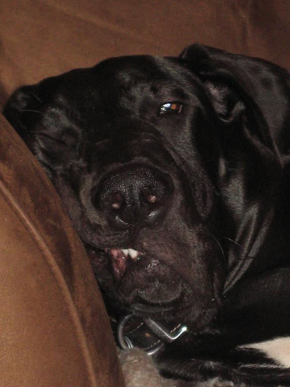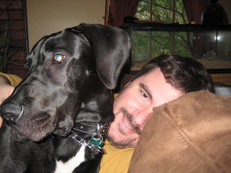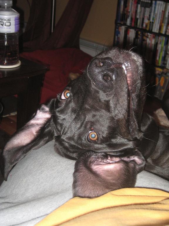 Great Danes are wonderful dogs, they're 150+ lb lapdogs. I still miss my old Dane. He'd walk up to you when you were on the couch and bump you with his head then step back and look at you. Then he'd do it again. Then take about two steps backwards and to the side, jump, bounce off the wall, slide right down between you and the back cushions on the couch, effectively ejecting you into the middle of the living room floor, then he'd just look at you with his eyes saying "What? I just asked you twice to move..."
