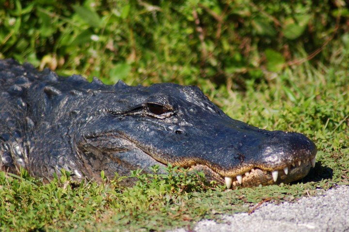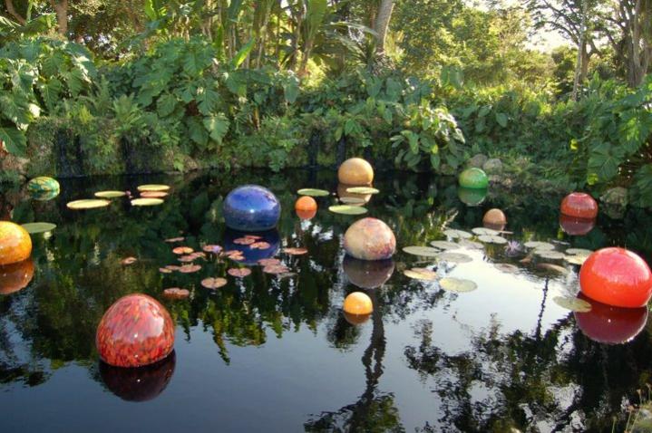 An alligator, a bird, and a reflecting pond with some glass balls in it. The glass balls are sculptures by Chihuly.