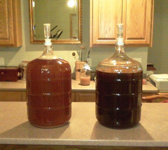 I racked over two beers to carboys tonight. First is a Belgian raspberry ale, and the second is a nut brown ale. The colors in the picture aren't so great. The raspeberry ale is quite red, and the nut brown isn't so dark. They both taste really good.