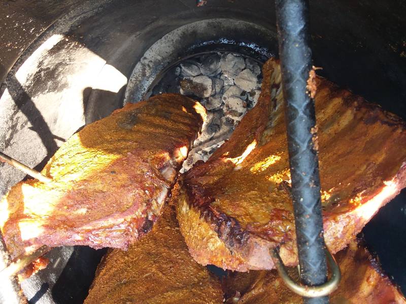 Four racks of spares for a private thing at a friend's brewery yesterday evening. As pork ribs go, these racks were big, 13 or 14 bone and over 5 lbs each (that's a full size chafer tray in the second photo - the ends were only about 2 inches from the coals during the cook) That and a half-chafer of hog apple beans w/ extra bacon on the side and there were a lot of happy people... (although that could have been the free beer)