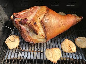Mojo criollo marinated pork leg. Just put on about 15 minutes ago. Going to roll at 225 for a few hours then bump it to 275-300 to finish.