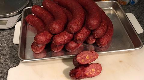Cheesy beef/pork smoked sausages. Has some sweet bonnet peppers in it. They look like scotch bonnets, but no where near the heat. Thought it needed more after eating some of the finished sausage, but the tongue is tingling.