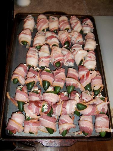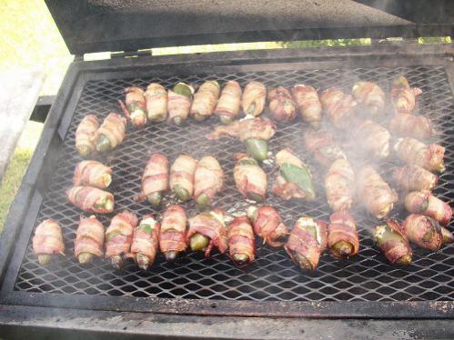I didn't cut the jalapeno peppers in half, I just cut the stems off and cored the peppers with an old peeler. I stuffed the peppers with the mixed cream cheese, chedar cheese and minced garlic.. pop in a lil smokie, wrap with bacon.....