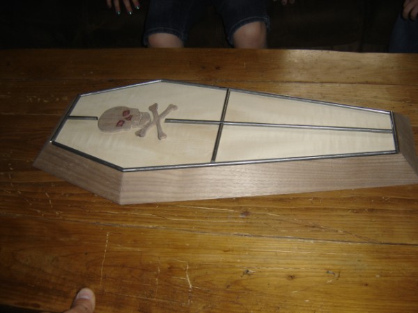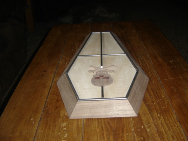 Here are some rough pics of the lid, mind you it will be darker once the oil goes on and the grain will show better on the tiger maple and walnut, the skull is black mesquite and eyes and nose are filled with heartwood. I think it's coming along great, can't wait for the oil to go on!!!