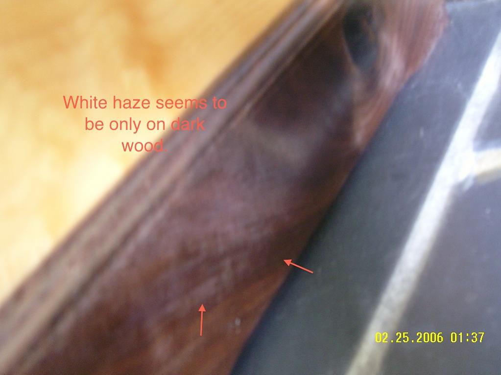 Builder: "I believe the white haze to be dust that got in to the lacquer..... Not really a hard thing to fix.... that's what it looks like to me. I try to ensure that don't happen, but sometimes it gets pretty dusty in the shop.... and my eyes don't see straight....