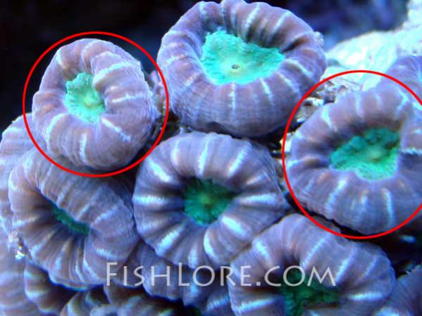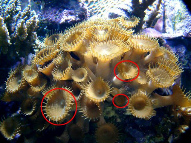 below are 5 different kinds of coral in red are circled individual polyps. each polyp is its own organism and under the right circumstances can live on its own.