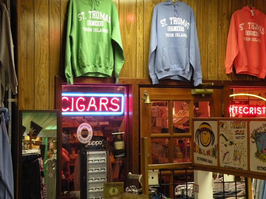 This is a picture of the inside of a souvenir shop in St. Thomas American Virgin Islands. I found the people there to be really nice. This walk in humidor was pretty good, although I really didn't care much for the guy behind the counter's knowledge...but that's just me. I didn't buy any cigars here, I went down to another place with a smaller humidor. The smaller humidor had open boxes of Opus', tins of Opus'; Fuente's; Padrons; and five packs of a cigar from Barbados that uses Cuban filler tobacco. (Royal Barbados maybe.) Anyway, my wife shopped for purses; tshirts; etc...and I shopped for cigars...seemed about right.