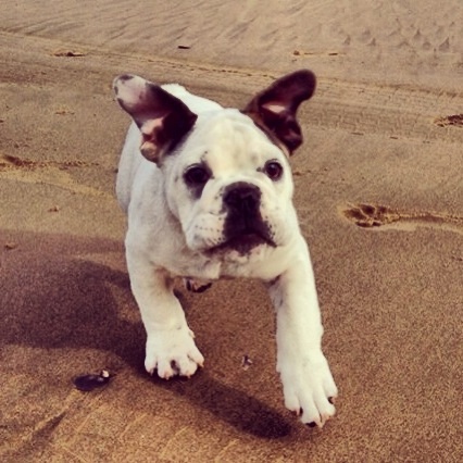 My English Bulldog pup Baxter, running on the beach.
