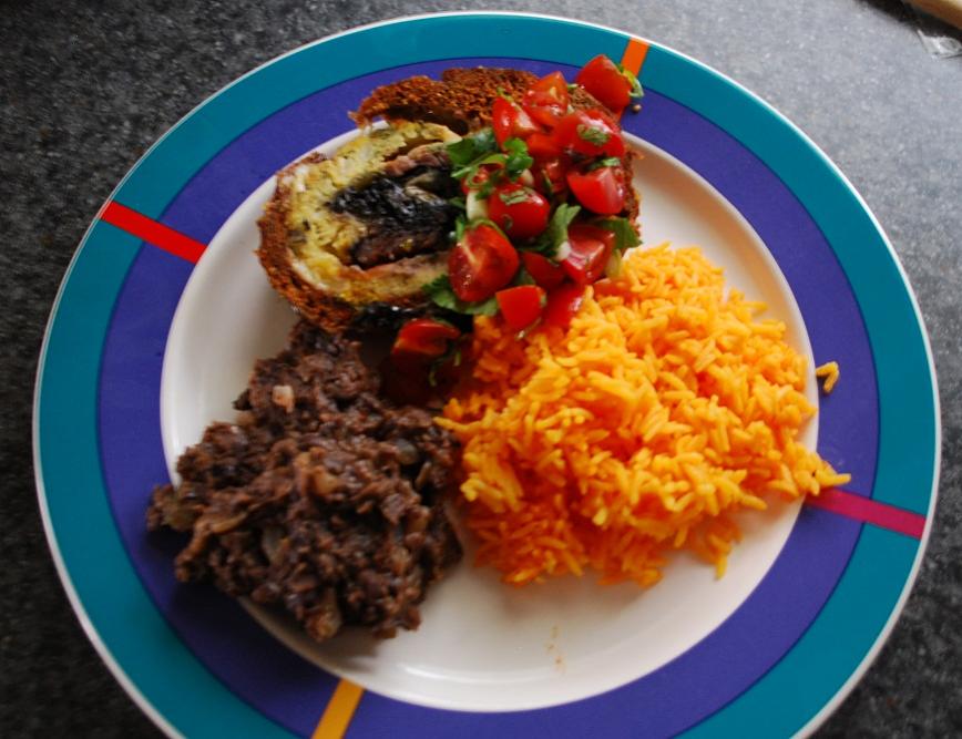 The finished producted turned out awesome, served along some mexican rice and refried black beans. The cornbread batter tasted a lot more like a tamale, soaking up a lot of the rendered fat from the sausage. One bite you get a taste of the chile/cheese/huitlacoche, another the cornbread and a nugget of the shortribs.