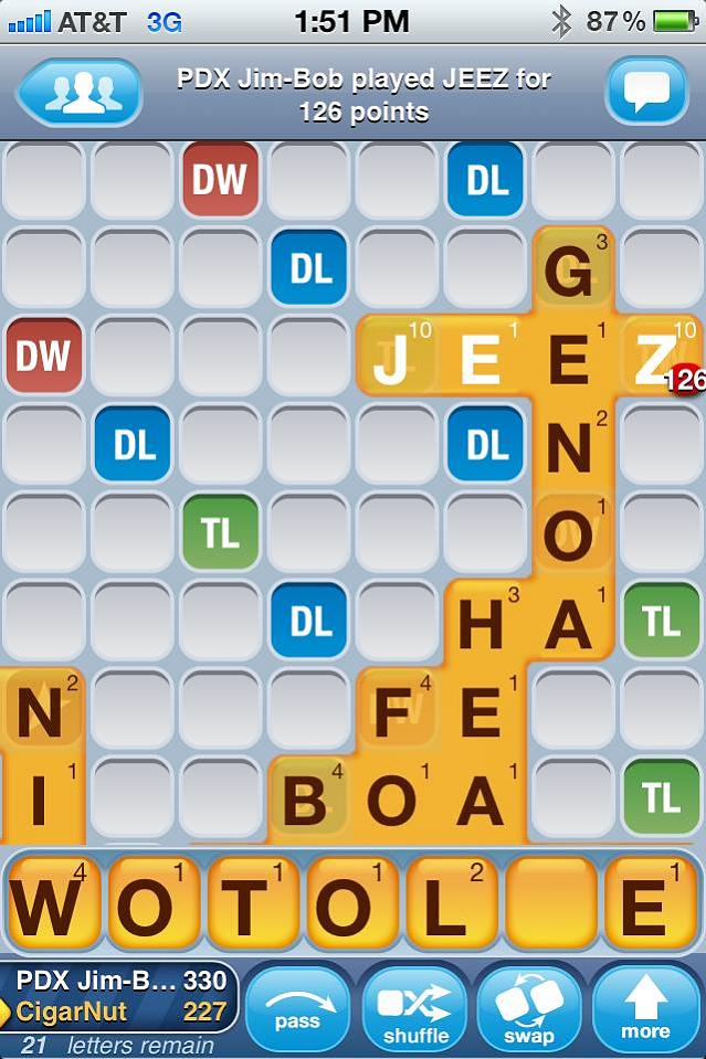 It's interesting how a game can turn on a single word... I was ahead by 23 points and my friend played the four letter word "jeez". The "j" was a triple letter and the "z" was a triple word: 126 points.