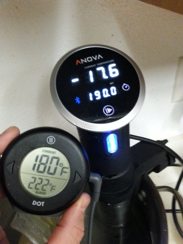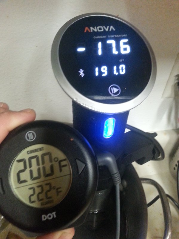 Put some country ribs (pork shoulder) in the tank about 5 hours ago, will pull them out tomorrow evening at somewhere around 34-36 hours. Currently running the bath at 140F, but debating if I want to raise it a bit.