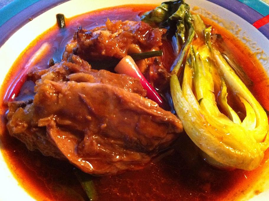Korean style, braised pig foot/hock with baby bok choy and green onions.