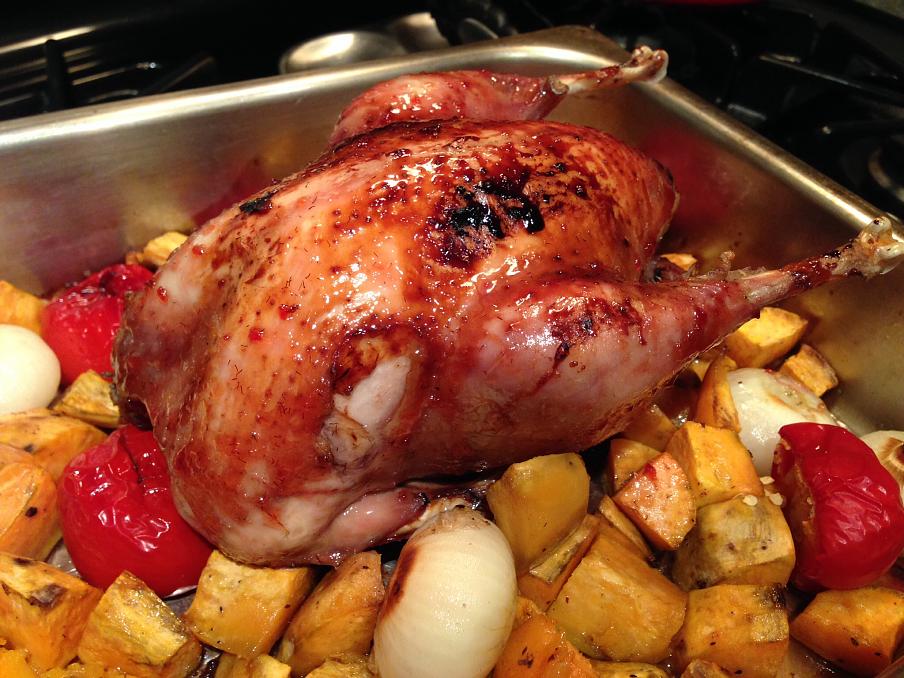 Roasted pheasant glazed with a spicy starwberry jam, sweet potatoes, cipollini onions and cherry peppers.