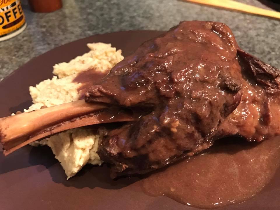 Portuguese style lamb shanks, with mashed cauliflower. Recipe from my friends cookbook, Buck, Buck, Moose. (Alas no venison his year). The sauce alone is worth the price of the book.