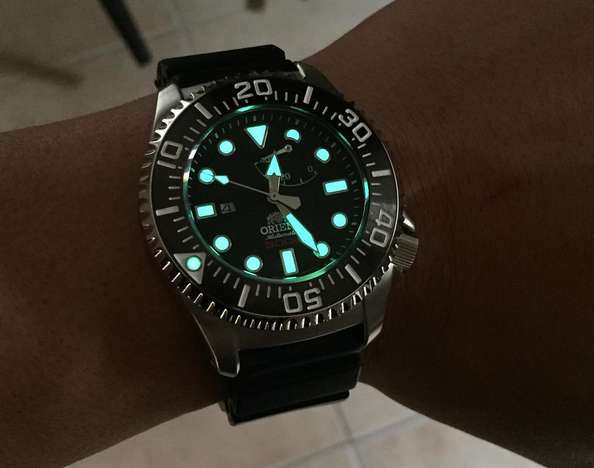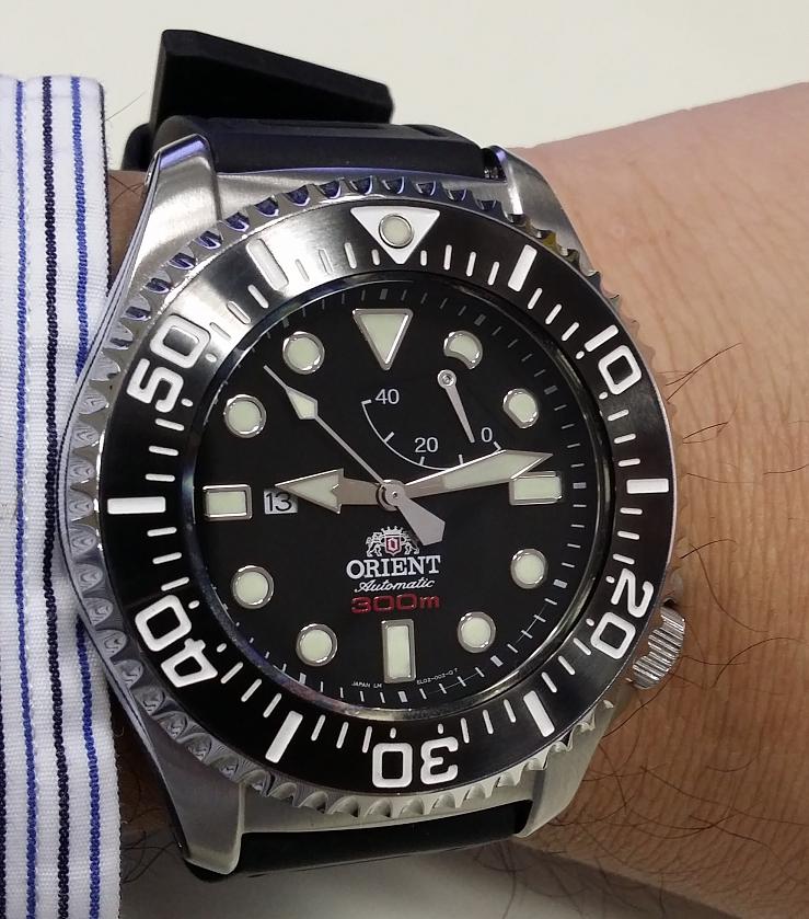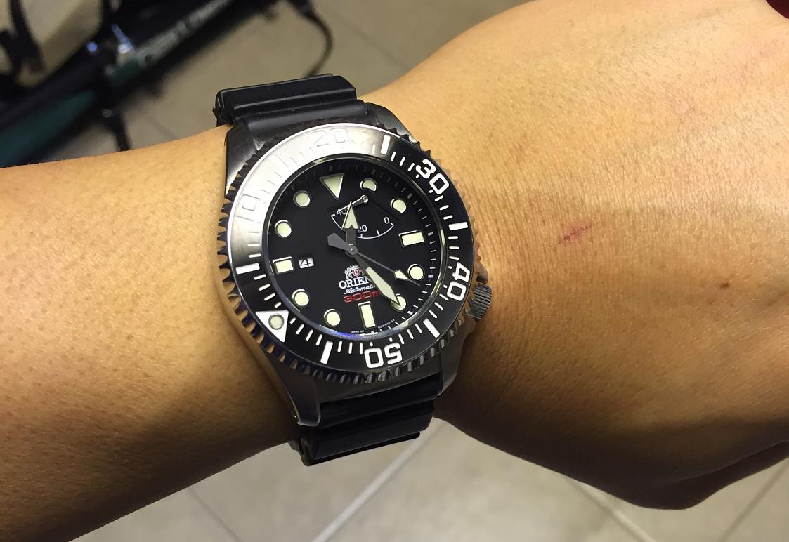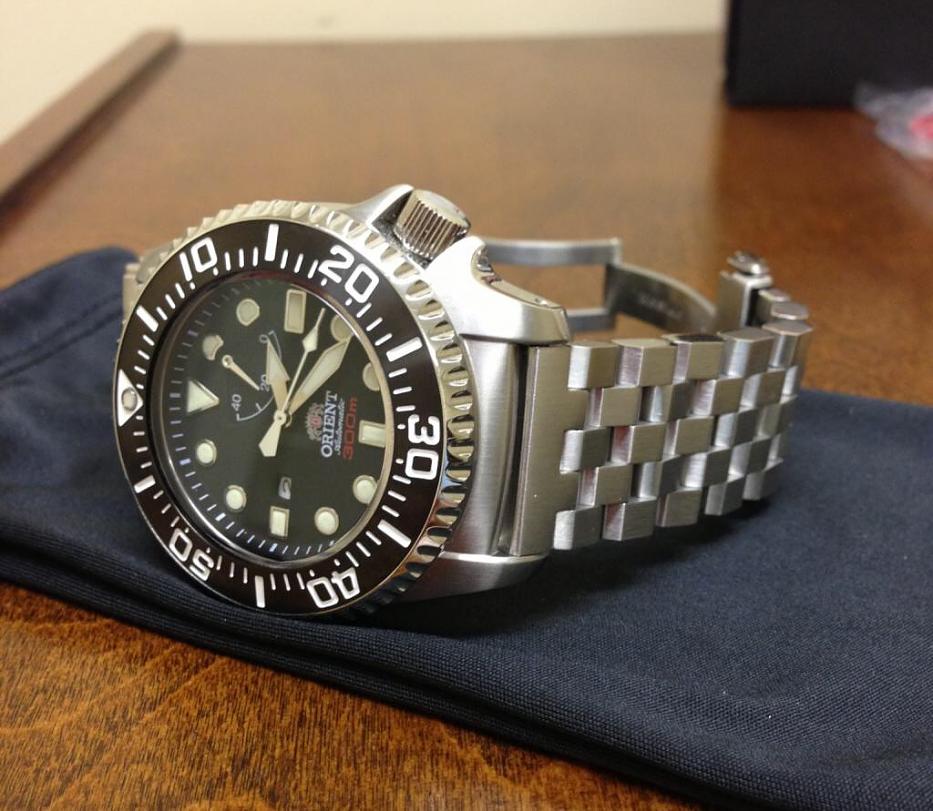 Orient 300 came today, this is a nice chunk, way to big for the stock bracelet, glad I ordered another one that will be here fri. Winding is smooth as butter, bezel is the same, seems like a good trade