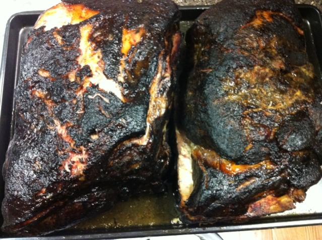 My thermometer was giving crazy readings and all I could find to give me any kind of internal temp are those worthless electronic forks to tell you the temp (rare, med. rare, med., etc). I was paranoid about overcooking without having a real number to go by, so I pulled them. I'll also start the butts for an overnighter next time as well to have all day to bring up to the temp needed.