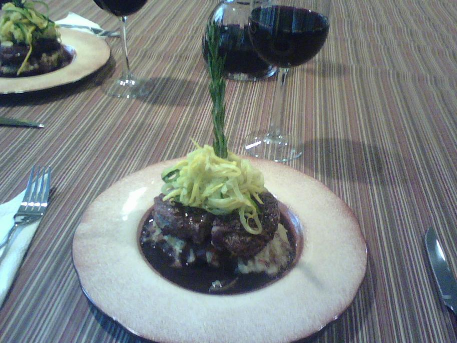 Grilled filet mignon over a herbed boursin (a type of soft cheese), lobster and porcini mashed potato cake with yellow and green squash "ribbons" on top with a Porcini, rosemary Cabernet reduction. It was GOOOOOOOOD. Topped it off with a 1999 Michel Schlumberger Cabernet Sauvignon. Yum! Might end tonight with a Padron 40th anni Maduro.