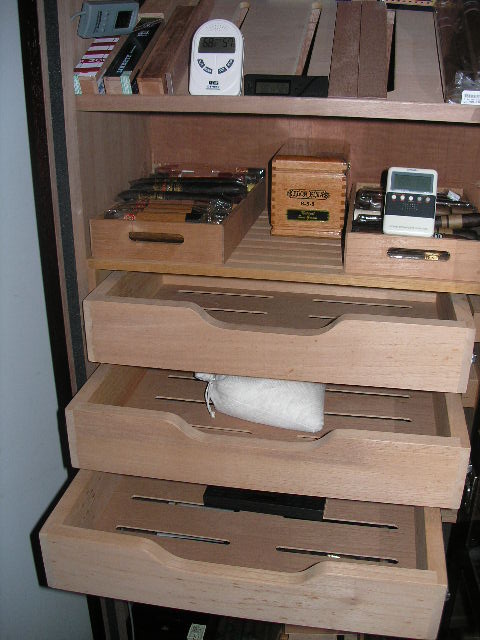 So I removed 2 of the angled display shelves and replaced them with a set of 3 drawers that I built . I bought most of my Spanish cedar on Ebay . The drawers are 3 - 1/4 inches high , 12 inches deep and about 17 inches wide . Enough room for plenty of singles and makes the cabinet more useful for me . I had looked around quite a while and when I bought this unit . I must have gotten this unit confused with another I saw somewhere that had adjustable shelves so that is why I modified it . In another day or 2 I will put the rest of my cigars from my cooler inside it .