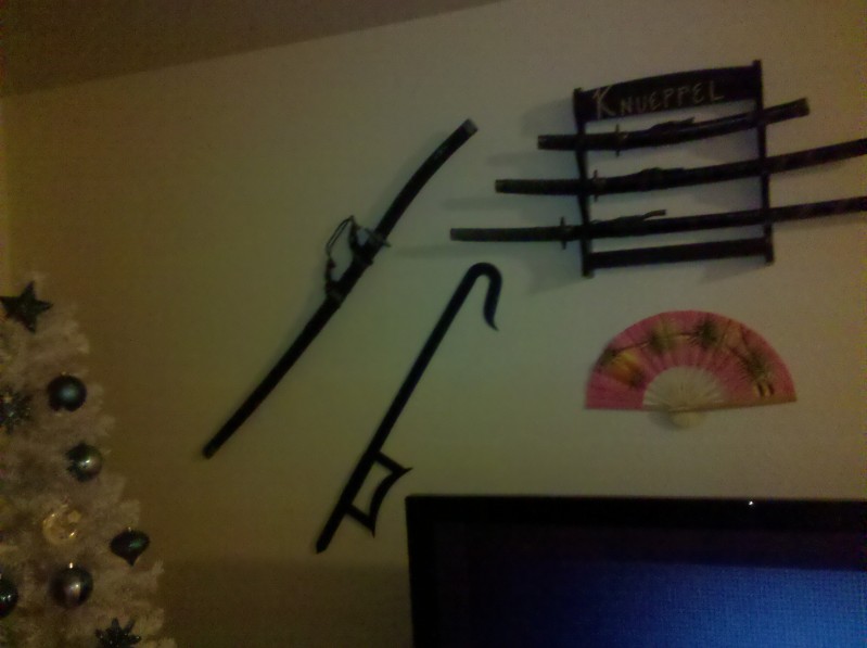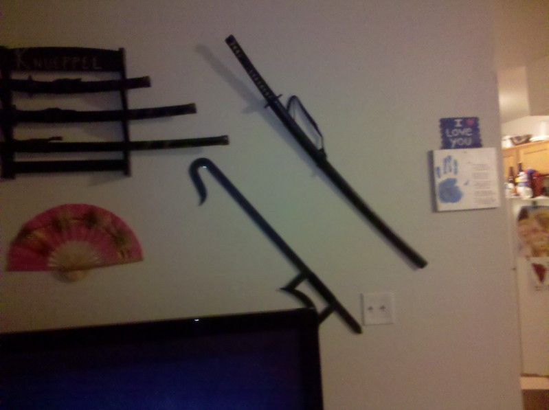 The katana on the right side of my tv is the original one I broght back with me from japan. Its real forged steel. And the one on the left side is one I bought in japan for my wife. Its a ceremonial katana. Next time I go back to japan I'm going to grab a couple more.