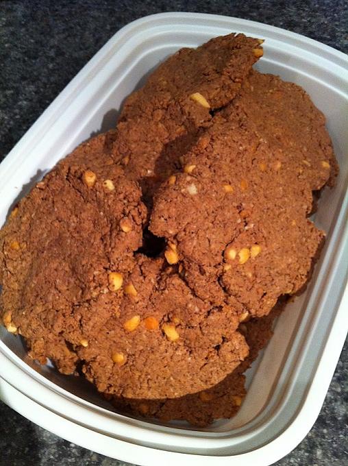 Mix all ingredients together in a bowl. You may need to use your hands at the end to pull it all together into one big ball. Divide into 1oz portions. You should get 18 in total. Place each portion on a baking sheet and press down to form a cookie sized piece. These cookies will not spread out in the oven. Bake in a 350F oven for 10-12 minutes. Remove baking sheet from oven, let stand for a couple of minutes then transfer to a wire rack or paper towels on the counter to cool completely. Enjoy!
