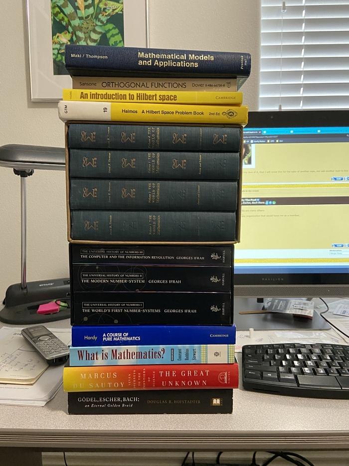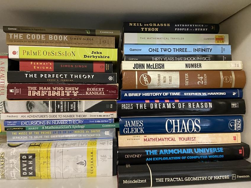 Here is a pic of my "fun" math books, well, except for the CRC which is there to help me understand some of the rest.